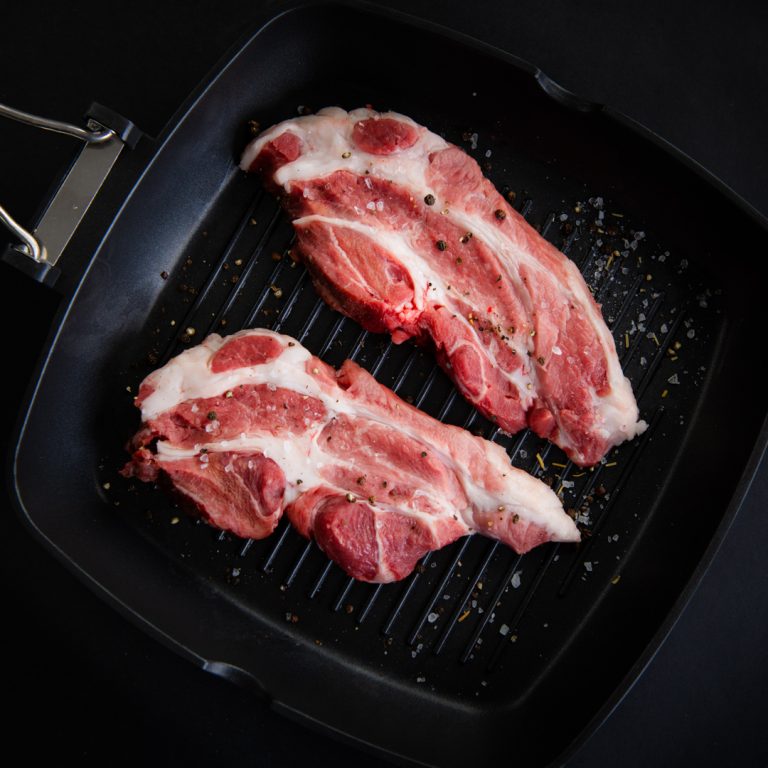 Friss nyakkaraj (tarja) a helyi gazdaságokból. A sertés színe-java.